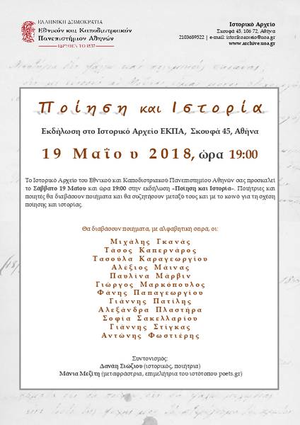 Εκδήλωση στο Ι.Α. ΕΚΠΑ με θέμα: Ποίηση και Ιστορία. Έλληνες ποιητές και ποιήτριες διάβασαν ποιήματά τους συνομιλώντας ταυτόχρονα με την ιστορία.