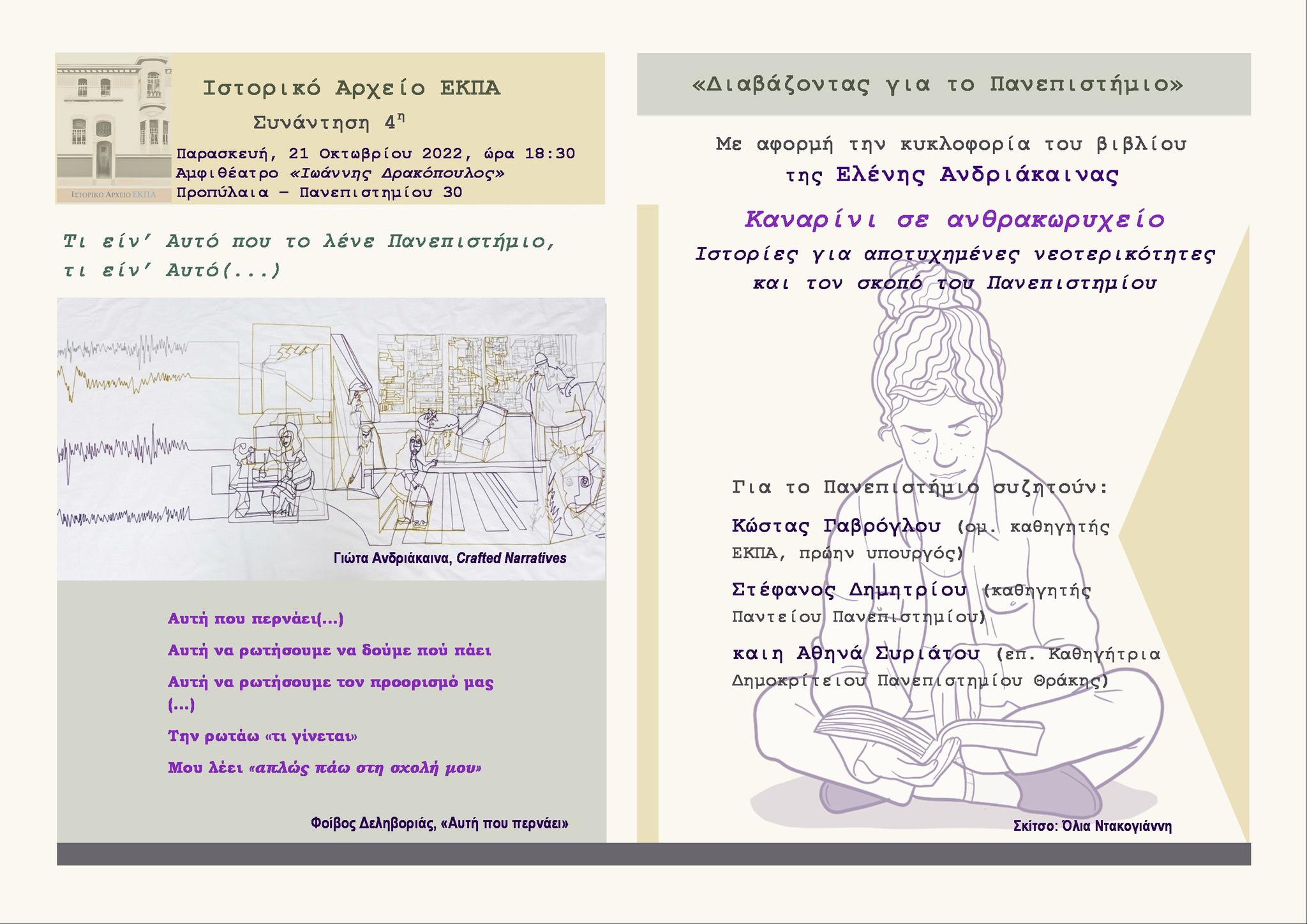 Το Ι.Α. ΕΚΠΑ πραγματοποίησε την 4η συνάντηση του κύκλου: «Διαβάζοντας για το Πανεπιστήμιο» με την παρουσίαση του βιβλίου της Ελένης Ανδριάκαινα, Καναρίνι σε ανθρακωρυχείο-Ιστορίες για αποτυχημένες νεοτερικότητες και τον σκοπό του Πανεπιστημίου. Το βιβλίο πραγματεύεται τις μεταρρυθμίσεις που έγιναν στα βρετανικά πανεπιστήμια τη δεκαετία του ΄80 και οι οποίες λειτούργησαν ως πρότυπο για πολλές άλλες χώρες της Ευρώπης. Για το βιβλίο συζήτησαν οι: Κώστας Γαβρόγλου, ομ. καθηγητής ΕΚΠΑ, πρώην υπουργός, Στέφανος Δημητρίου, αν. καθηγητής Παντείου Πανεπιστημίου και η Αθηνά Συριάτου, επ. καθηγήτρια Δημοκριτείου Πανεπιστημίου Θράκης. Η εκδήλωση πραγματοποιήθηκε στο αμφιθέατρο «Ιωάννης Δρακόπουλος», κεντρικό κτήριο Πανεπιστημίου Αθηνών.