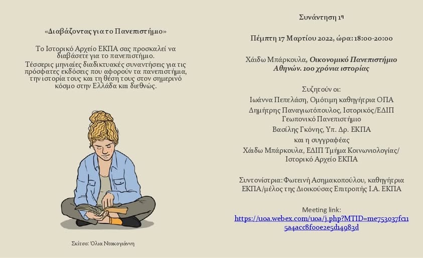 Το Ι.Α. ΕΚΠΑ, θέλοντας να συμβάλει στη συζήτηση γύρω από το πανεπιστήμιο αλλά και να προβάλει την τρέχουσα βιβλιογραφική και επιστημονική παραγωγή γύρω από τον πανεπιστημιακό θεσμό στην Ελλάδα και διεθνώς, οργάνωσε έναν κύκλο μηνιαίων διαδικτυακών συναντήσεων. Στις συναντήσεις αυτές παρουσιάστηκαν και συζητήθηκαν, βιβλία της τρέχουσας εκδοτικής παραγωγής γύρω από την ανώτατη εκπαίδευση. Τί γνωρίζουμε για το Πανεπιστήμιο και την εξέλιξή του στον δυτικό κόσμο τα τελευταία χρόνια; Πώς μπορούμε να κατανοήσουμε το παρόν και το μέλλον του πανεπιστημίου αν δεν γνωρίζουμε το παρελθόν του; Πώς μπορούμε να κατανοήσουμε τις προτάσεις μεταρρύθμισης του ελληνικού πανεπιστημίου αν δεν τις εντάξουμε στη διεθνή συζήτηση; Πόσο η συζήτηση για την ανώτατη εκπαίδευση αξιοποιεί μια σημαντική βιβλιογραφία γύρω από αυτό, η οποία έχει παραχθεί τα τελευταία χρόνια στην ελληνική γλώσσα, είτε πρωτότυπες μελέτες, είτε μεταφράσεις; Στο πλαίσιο αυτό πραγματοποιήθηκε η 1η συνάντηση «Διαβάζοντας για το Πανεπιστήμιο» παρουσιάζοντας το βιβλίο της Χάιδως Μπάρκουλα, ΕΔΙΠ ΕΚΠΑ, Οικονομικό Πανεπιστήμιο Αθηνών. 100 χρόνια ιστορίας. Συζήτησαν με την συγγραφέα για το βιβλίο οι: Ιωάννα Πεπελάση, Ομότιμη καθηγήτρια ΟΠΑ, Δημήτρης Παναγιωτόπουλος, Ιστορικός/ΕΔΙΠ Γεωπονικό Πανεπιστήμιο, Βασίλης Γκόνης, Υπ. Δρ. ΕΚΠΑ, ενώ τον συντονισμό της εκδήλωσης είχε η Φωτεινή Ασημακοπούλου, καθηγήτρια ΕΚΠΑ/μέλος της Διοικούσας Επιτροπής Ι.Α. ΕΚΠΑ.
