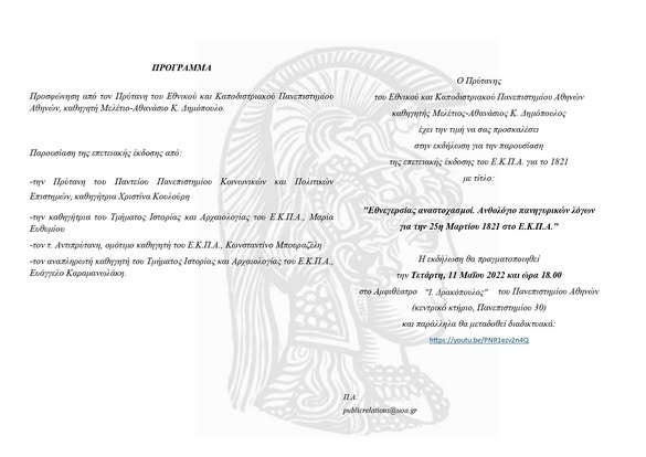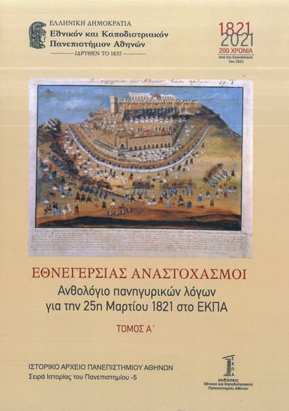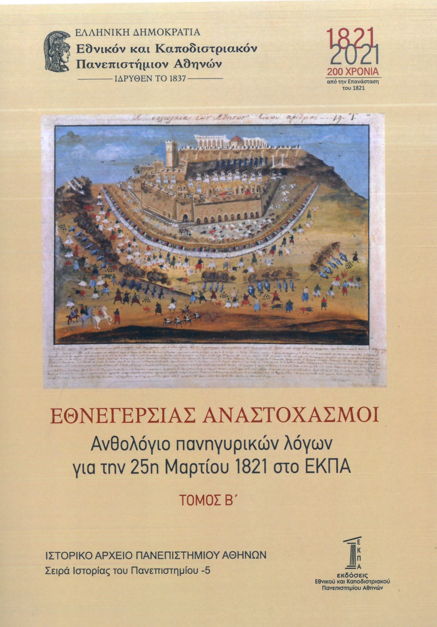 Παρουσίαση του δίτομου: Εθνεγερσίας Αναστοχασμοί. Ανθολόγιο πανηγυρικών λόγων για την 25η Mαρτίου 1821 στο ΕΚΠΑ. Το δίτομο κυκλοφόρησε από τις εκδόσεις του ΕΚΠΑ στη σειρά Ιστορίας του Πανεπιστημίου από το Ιστορικό Αρχείο του ΕΚΠΑ και πρόκειται για ανθολόγιο πανηγυρικών λόγων για το 1821 με λόγους που εκφωνήθηκαν στο Εθνικό και Καποδιστριακό Πανεπιστήμιο Αθηνών από την καθιέρωση του επίσημου εορτασμού της επετείου της κήρυξης του Αγώνα της Ανεξαρτησίας έως το 2021. Την εκδοτική ομάδα που ανέλαβε το έργο της επιλογής και της έκδοσης απάρτισαν: ο ομότιμος καθηγητής της Αρχαίας Ιστορίας και πρώην Αντιπρύτανης του ΕΚΠΑ Κωνσταντίνος Μπουραζέλης, ο οποίος και εμπνεύστηκε και σχεδίασε το συνολικό έργο, ο Βαγγέλης Καραμανωλάκης (αν. καθηγητής Θεωρίας και Ιστορίας της Ιστοριογραφίας), η Χάιδω Μπάρκουλα (ΕΔΙΠ) και η Χριστίνα Μπάκουλα (Ιστορικός, ΜΤΔΕ). Ο τόμος εκδόθηκε με αφορμή την επέτειο των 200 χρόνων από την Επανάσταση του 1821 και αποτυπώνει τον κομβικό ρόλο του Πανεπιστημίου της Αθήνας στην πολιτική και κοινωνική ζωή της χώρας και την συνειδητοποίηση της ιστορίας της. Ο πρώτος τόμος περιλαμβάνει 33 λόγους από το 1871, με αφορμή τον εορτασμό των πενήντα χρόνων από την Επανάσταση, έως το 1967. Σε αυτούς συμπεριλαμβάνονται όχι μόνο οι πανηγυρικοί της 25ης Μαρτίου, αλλά και οι λόγοι που εκφωνήθηκαν στις τελετές των αποκαλυπτηρίων των ανδριάντων που κοσμούν τα Προπύλαια του Πανεπιστημίου, ορόσημα για τη συγκρότηση της συλλογικής μνήμης του 1821. Στον Β´ τόμο περιλαμβάνονται 23 λόγοι από τις παραμονές της απριλιανής δικτατορίας έως και σήμερα (1967-2021). Οι ανθολογούμενοι λόγοι εκφωνήθηκαν από σημαντικούς επιστήμονες, κατά κανόνα μελετητές και μελετήτριες του 1821 και των ευρύτερων διαστάσεών του. Ορισμένα από αυτά τα κείμενα αποτελούν σημαντικά δοκίμια που προσφέρουν μια πολύπλευρη και πολυπρισματική θέαση της Επανάστασης. H θεματολογία τους επικεντρώνεται κατεξοχήν σ’ αυτό καθ’ αυτό το γεγονός της Επανάστασης, ενώ σε πολλές περιπτώσεις υπάρχει επικέντρωση σε πρόσωπα ή στους ήρωες του Αγώνα, σε άλλες δε περιπτώσεις στις ηρωικές στιγμές ή μάχες της επαναστατικής περιόδου (Αλαμάνα, Γραβιά, Μεσολόγγι, Ψαρά κ.ά.). Σε πολλούς από τους λόγους, η Επανάσταση εγγράφεται στη μακρά ιστορία του ελληνισμού, ενώ αναδεικνύονται συνδέσεις ιδιαίτερα με το αρχαιοελληνικό και το ρωμαϊκό, λιγότερο με το βυζαντινό παρελθόν. Παράλληλα η Επανάσταση συνδεόταν με τους αγώνες του ελληνικού κράτους, είτε το κρητικό ζήτημα, είτε τους Βαλκανικούς πολέμους ή την Μικρασιατική Εκστρατεία. Πολλά από τα κείμενα των πανηγυρικών είναι πλήρη αναφορών στην ποίηση και στην λογοτεχνία. Οι δυο τόμοι αποτελούν μια συλλογή διαφορετικών αναγνώσεων και μελετών της Επανάστασης του 1821. Παράλληλα η συλλογή αυτή αποτελεί ένα μοναδικό παρατηρητήριο για τις διαφορετικές προσλήψεις του Αγώνα αλλά και την εξέλιξη της νεοελληνικής ιδεολογίας στον 19ο και 20ό αιώνα, πολύτιμη για την παραπέρα νεοελληνική ιστοριογραφική έρευνα.