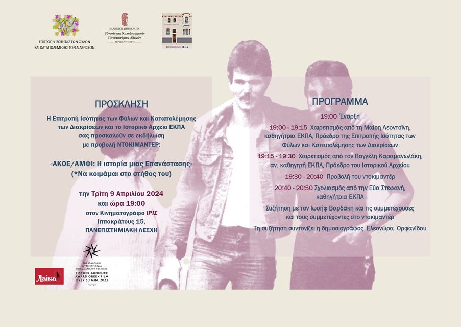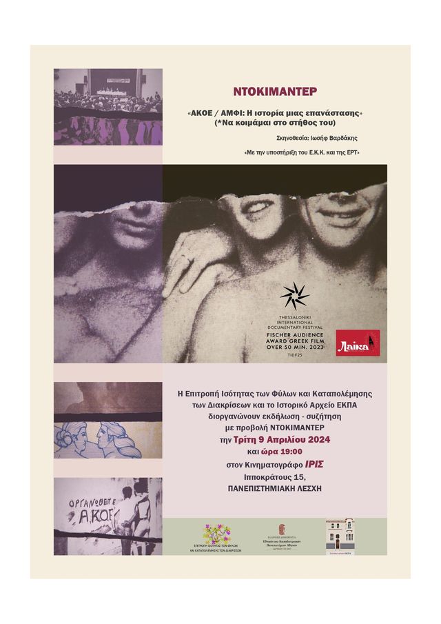 Η Επιτροπή Ισότητας των Φύλων και Καταπολέμησης των Διακρίσεων και το Ι.Α. ΕΚΠΑ πραγματοποίησαν εκδήλωση με προβολή ΝΤΟΚΙΜΑΝΤΕΡ: «ΑΚΟΕ/ΑΜΦΙ: Η ιστορία μιας Επανάστασης» (*Να κοιμάμαι στο στήθος του) στον Κινηματογράφο ΙΡΙΣ (Ιπποκράτους 15, Πανεπιστημιακή Λέσχη).