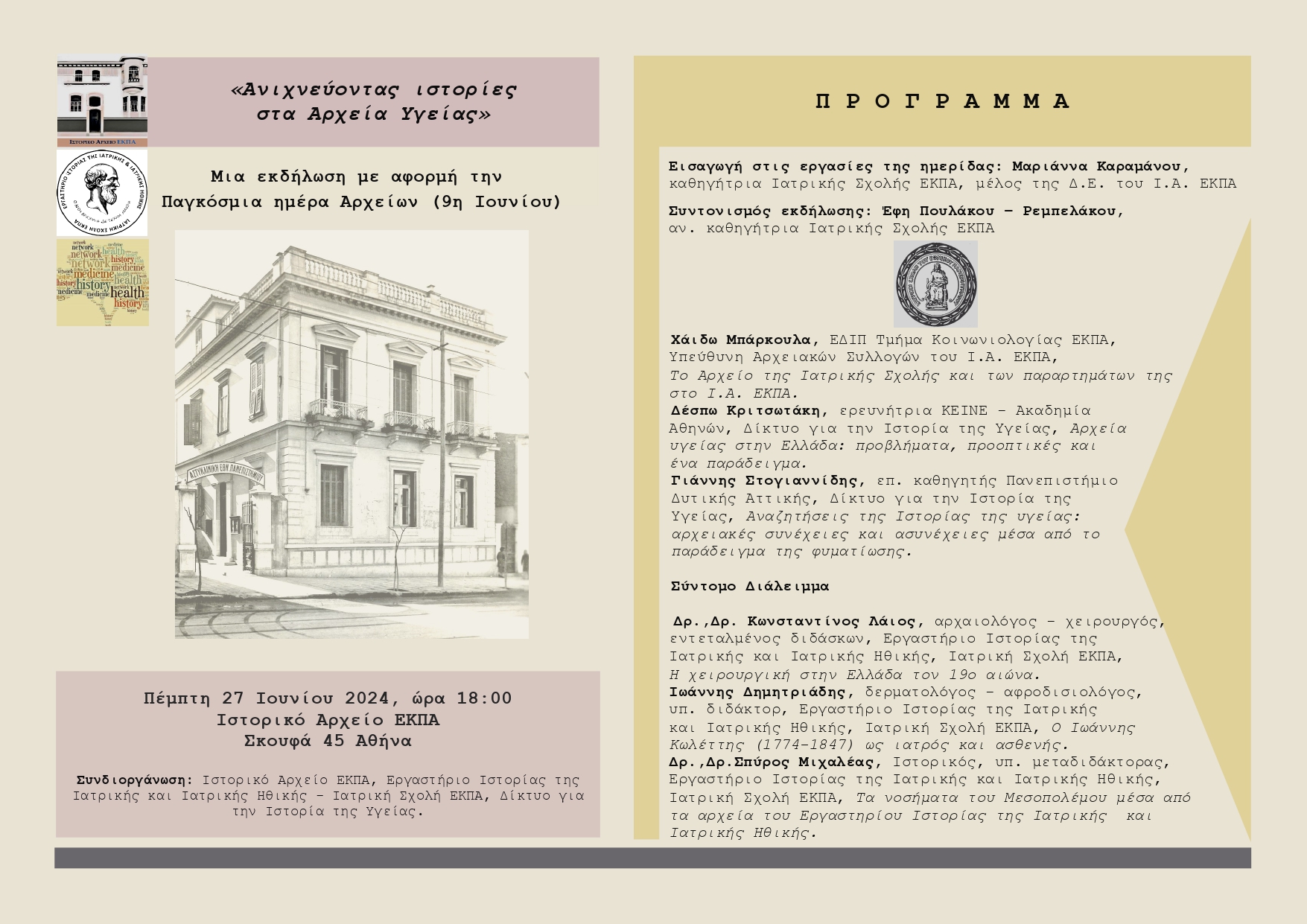 Τα Γενικά Αρχεία του Κράτους, το Ι.Α. ΕΚΠΑ, το Ιστορικό Αρχείο του Δήμου Αθηναίων και ο Δήμος Φιλοθέης – Ψυχικού, με αφορμή την Παγκόσμια Ημέρα Αρχείων πραγματοποίησαν εκδήλωση με θέμα: Τα φάρμακά σου φέρε Τέχνη…, που κάμνουνε -για λίγο- να μη νοιώθεται η πληγή»: αφηγήσεις μέσα από τα αρχεία υγείας. Τόπος διεξαγωγής: Κεντρική Υπηρεσία των Γ.Α.Κ., Δάφνης 61.